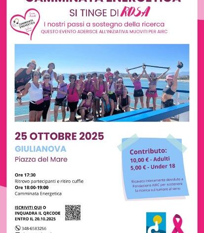 Tra le iniziative messe in campo dall’ufficio regionale Airc Abruzzo e Molise, infatti, anche quelle del 25 ottobre a Giulianova che, appunto sabato prossimo, ospiterà una passeggiata energetica per sostenere la ricerca. Il ritiro delle cuffie è fissato alle 17:30 in piazza del Mare, la partenza alle 18. Le iscrizioni vanno effettuate entro il 20 ottobre. Nella stessa sera, il Kursaal sarà illuminato di rosa.