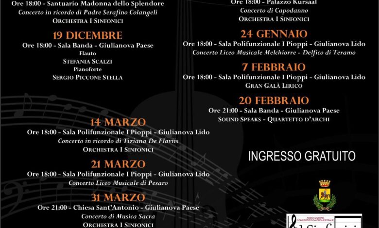 Tra gli appuntamenti di rilievo si segnala il Concerto di Capodanno, nella serata del 1 gennaio al Kursaal, che proporrà un originale arrangiamento delle musiche di Strauss, mentre l’intera stagione renderà inoltre omaggio al grande violoncellista giuliese Gaetano Braga, figura di spicco dell’Ottocento musicale e orgoglio della tradizione culturale locale.