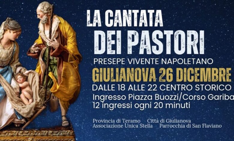 Giulianova. La Cantata dei pastori” è il titolo scelto per l’ edizione 2025 del Presepe Vivente, che si terrà nella sera del 26 dicembre, come ogni anno, in centro storico. Con il patrocinio della Comune di Giulianova e della Provincia di Teramo, l’evento è organizzato e promosso dall’ Associazione Unica Stella con il sostegno della Parrocchia di San Flaviano.