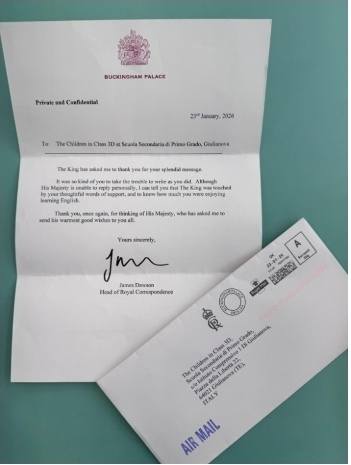 Gli studenti, guidati dalle prof.sse Mariacristina Adorante e Renata di Gioacchino, hanno scritto una lettera al Re Carlo d’Inghilterra e, con sorpresa e orgoglio, hanno ricevuto una risposta ufficiale.