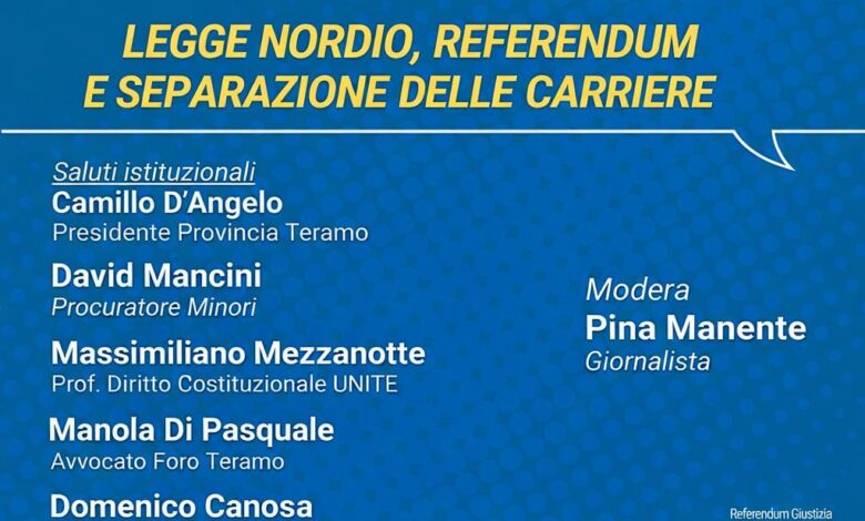 Si terrà venerdì 30 gennaio alle ore 17.30, presso la sala consiliare della Provincia di Teramo (Via G. Milli n. 2), l’incontro pubblico dal titolo “Legge Nordio, referendum e separazione delle carriere”, promosso dal Comitato “È giusto dire NO”.