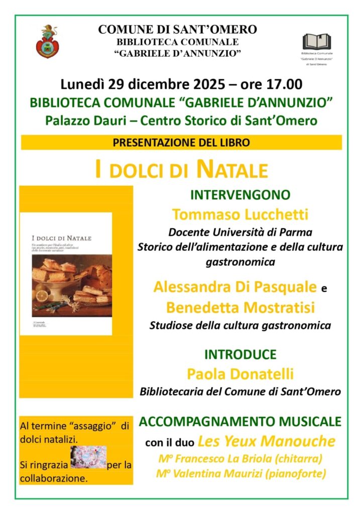A intervenire il professor Tommaso Lucchetti, docente all’Università di Parma, storico dell’alimentazione e della cultura gastronomica, le studiose Alessandra Di Pasquale e Benedetta Mostratisi, che ci offriranno una disamina delle specialità dolciarie del territorio italiano, tra cui l’Abruzzo. Durante l’incontro, che rientra nell’ambito della rassegna “Incontri con gli autori a Palazzo Dauri”, il duo Les Yeux Manouche formato dai maestri Francesco La Briola e Valentina Maurizi eseguirà brani della tradizione natalizia.