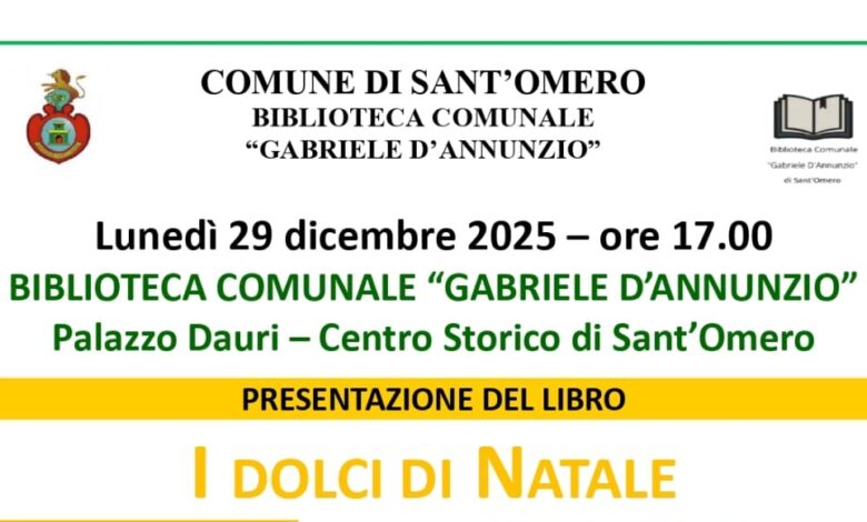 Sant’Omero. Si terrà lunedì 29 dicembre alle ore 17 a Palazzo Dauri, nel centro storico di Sant’Omero, la presentazione del libro “I dolci di Natale: un sentiero per l’Italia ed oltre tra storie, memorie, arti, tradizioni delle leccornie natalizie”.