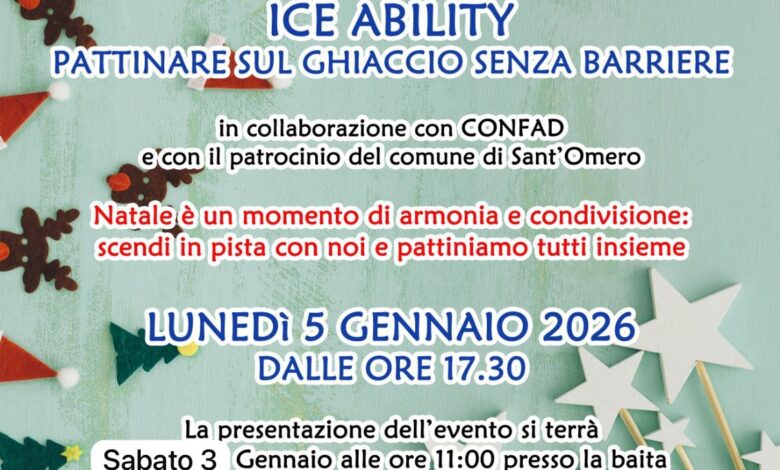 Sant’Omero. Lunedì 5 gennaio 2026, a partire dalle ore 17.30, sulla pista di ghiaccio di piazza De Curtis a Sant’Omero andrà in scenanun’esperienza speciale: pattinare tutti insieme, senza barriere.