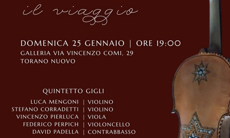 Torano Nuovo. Domenica 25 gennaio, alle ore 19.00, nella Galleria V. Comi di Torano Nuovo, si terrà “Il viaggio”, appuntamento musicale e narrativo nell’ambito della XXV edizione della Rassegna musicale “Al chiaro di luna”, un’edizione speciale che taglia il nastro del quarto di secolo.