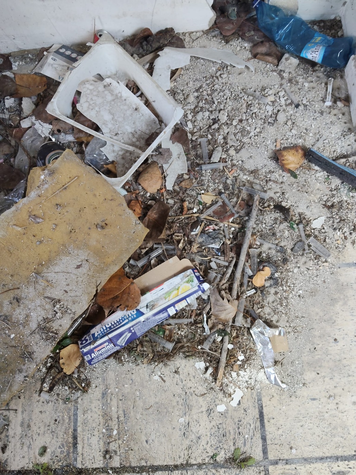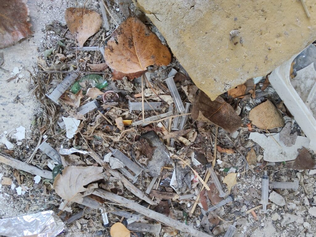accartocciate, pacchetti di sigarette, tante e tante siringhe con resti di carta d’alluminio.