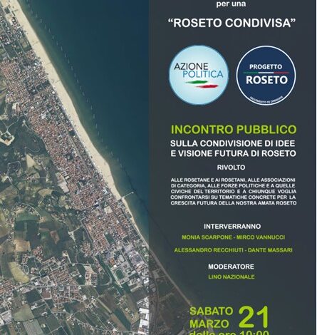 Roseto. Progetto Roseto e Azione Politica organizzano per sabato 21 marzo, ore 10, nei locali del ristorante pizzeria Marechiaro (lungomare Trento, 49), un incontro pubblico per affrontare alcuni temi che riguardano la città. Idee, proposte, una visione futura e condivisa di Roseto degli Abruzzi.
