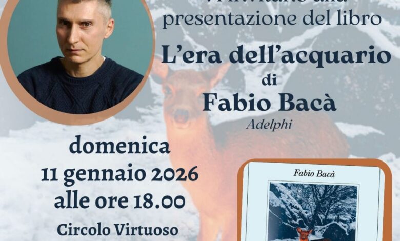 Giulianova. Domenica 11 gennaio, al Circolo virtuoso “Il Nome della Rosa”, ore 18, è in programma la presentazione del romanzo “L’era dell’acquario”. Incontro con l’autore Fabio Bacà e dialogo curato da Roberto Di Giovannantonio.