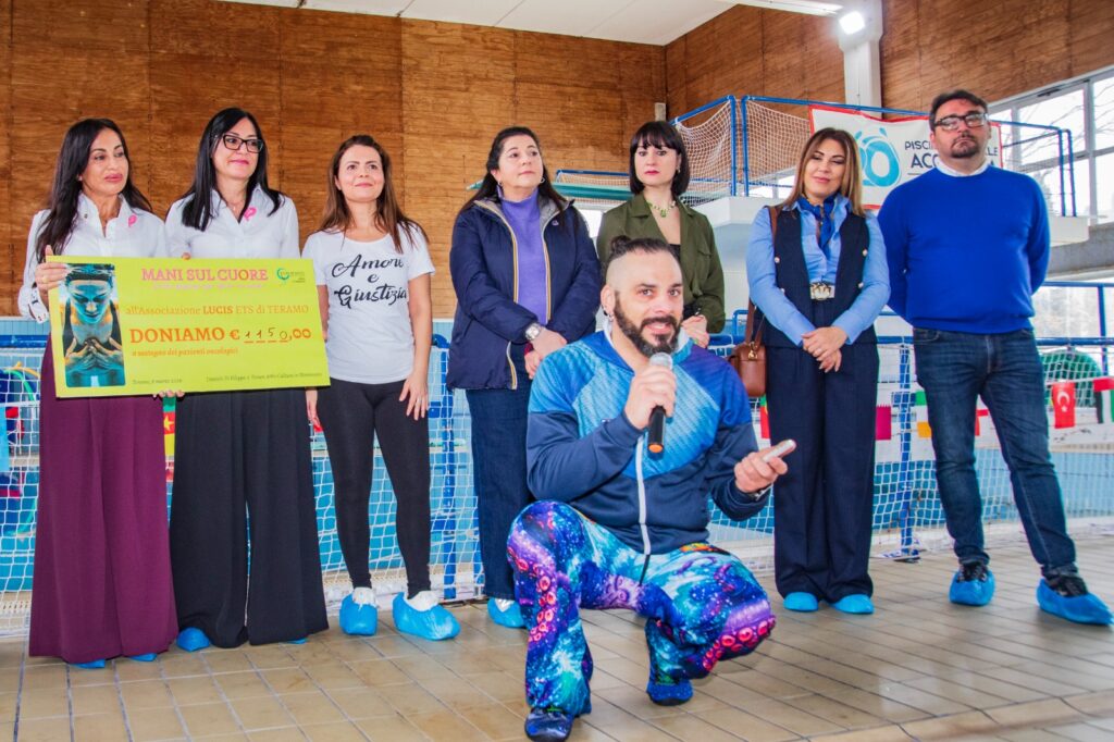 Teramo. Grande successo, ieri, domenica 8 marzo 2026, alla piscina comunale di Teramo, per l’evento sportivo a scopo benefico “Mani sul cuore. La tua presenza per donare un sorriso”, ideato dall’istruttore di “aquafitness” Daniele di Filippo e organizzato in collaborazione con l’Associazione “Forum Artis Cultura in Movimento”, rappresentata da Alessandra Angelucci.