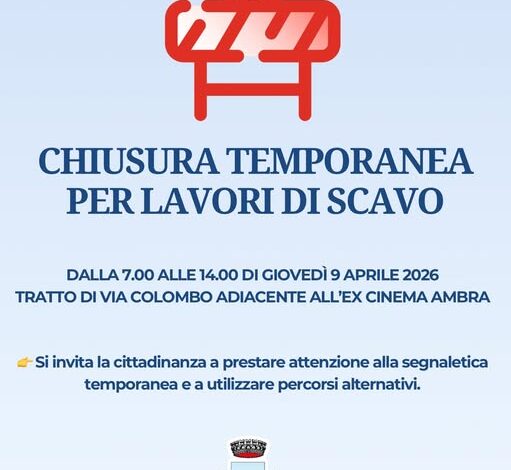 Martinsicuro. Per consentire l’esecuzione dei lavori di scavo nella giornata di giovedì 9 aprile è prevista la chiusura di un tratto di via Colombo, a Martinsicuro, in prossimità del nuovo edificio che in passato ospitava il Cinema Ambra (ora MaCu).