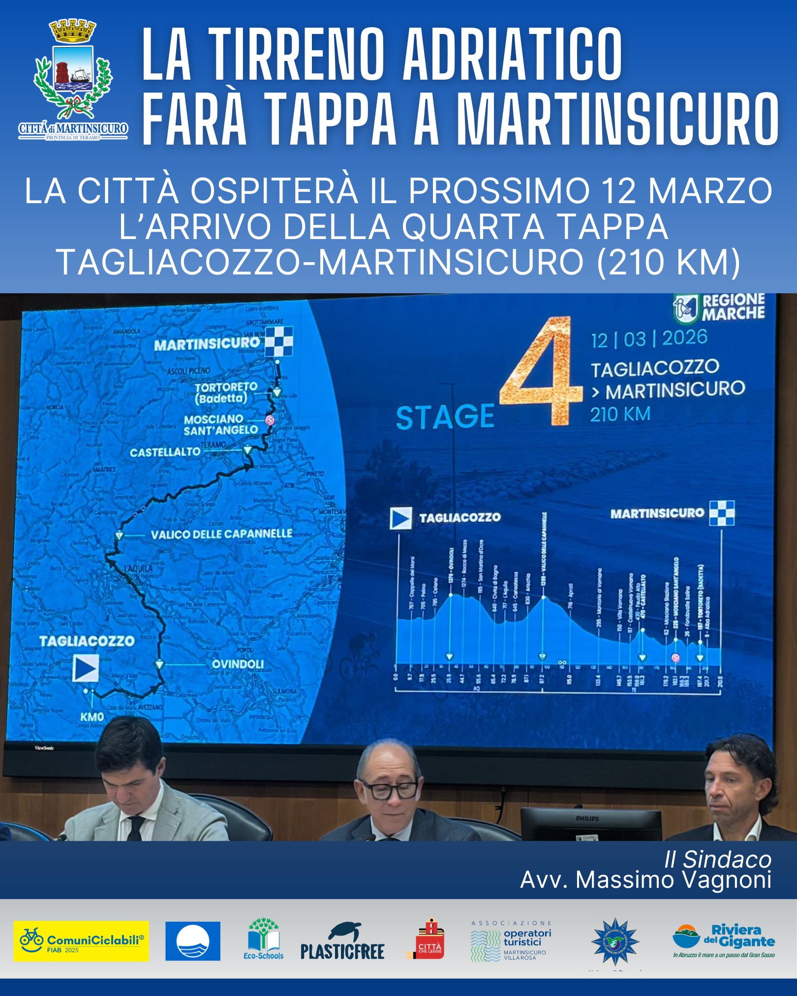 “Ospitare l’arrivo di una tappa della Tirreno-Adriatico è un motivo di orgoglio per Martinsicuro. Si tratta di un evento sportivo di caratura internazionale che valorizza il nostro territorio, rafforza l’immagine della città e rappresenta un’importante occasione di promozione e crescita. Continuiamo a lavorare affinché Martinsicuro sia sempre più protagonista nel circuito dei grandi eventi. Il 2026 e’ un anno particolare per la nostra Città e per la Val Vibrata che ha ottenuto il riconoscimento di comunità europea dello Sport 2026.