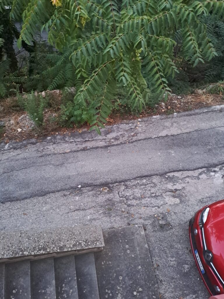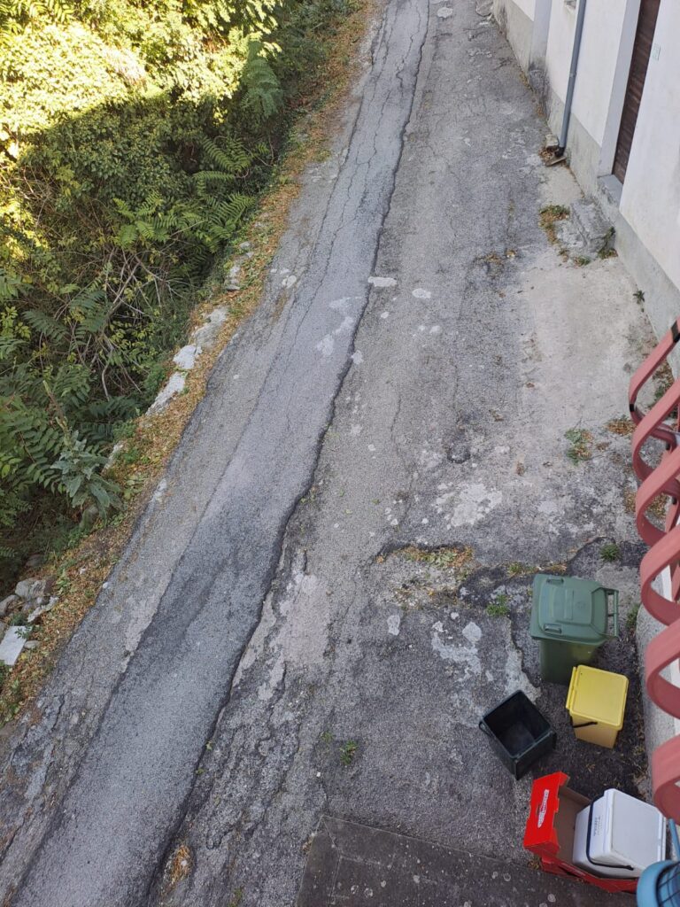 Ma la questione più grave riguarda la scarpata che affianca alcune abitazioni della frazione. Dopo il terremoto, il terreno ha iniziato a cedere e, con gli anni di incuria e assenza di manutenzione, la situazione è peggiorata visibilmente. La stradina in salita che costeggia le case sta lentamente franando insieme alla scarpata, perdendo pezzi giorno dopo giorno.