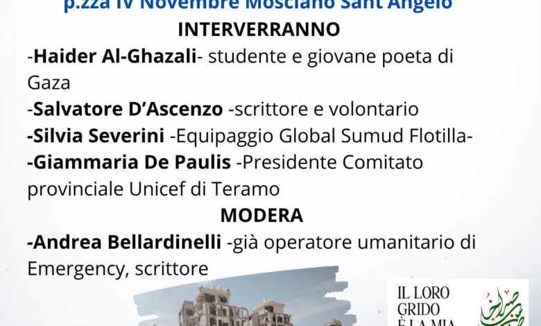 Dopo i saluti istituzionali del Sindaco Giuliano Galiffi e dell’Assessore alla Cultura Donatella Cordone ci saranno gli interventi di Haider Al-Ghazali, studente dell’Università di Macerata e giovane poeta di Gaza; Salvatore D’Ascenzo, scrittore e volontario; Silvia Severini, membro dell’equipaggio della Global Sumud Flotilla; Giammaria De Paulis, Presidente del Comitato provinciale dell’Unicef Teramo. Modera Andrea Bellardinelli, scrittore ed operatore umanitario di Emergency. Nel corso della serata ci sarà un intermezzo musicale a cura del Prof. Michele De Flavis, mentre le letture delle poesie saranno a cura di Luca Mastrocola, Jacopo Di Lazzaro, Riccardo Trullo e Vanina Ambrosini.