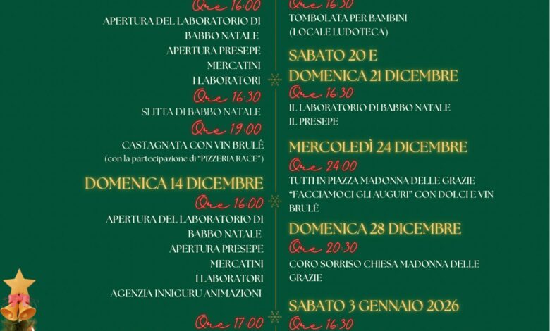 Le settimane successive offriranno diversi appuntamenti pensati per tutte le età: dalla tombolata per bambini del 20 dicembre, alla notte degli auguri in Piazza Madonna delle Grazie il 24, fino al concerto del Coro Sorriso del 28 dicembre. Anche i legami familiari saranno protagonisti grazie alla giornata dedicata a nonni e nipoti del 3 gennaio, mentre il 5 gennaio sarà la Befana a concludere il periodo delle festività.