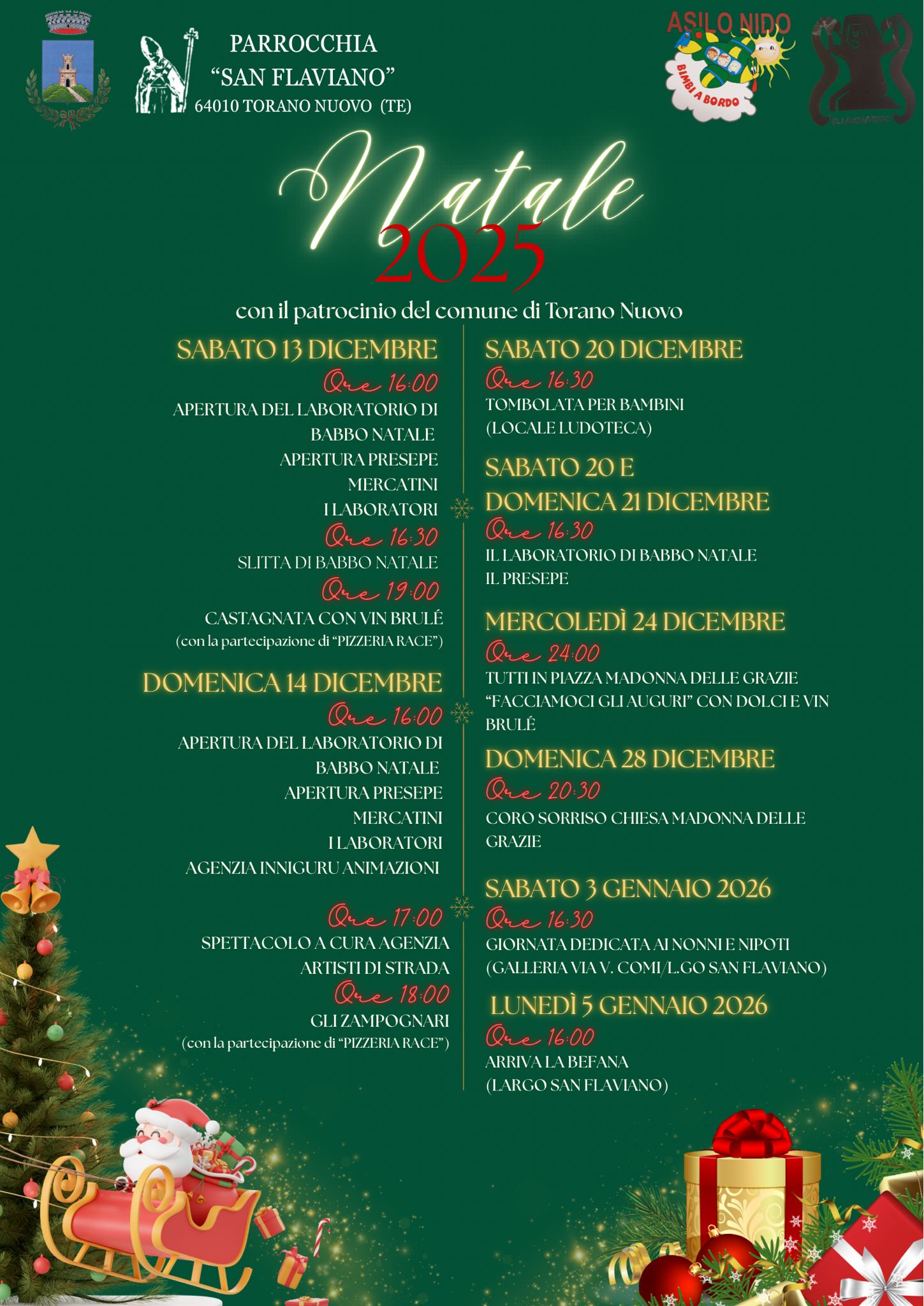 Torano Nuovo torna a vestirsi di luci, tradizioni e atmosfera natalizia grazie al ricco calendario di eventi promosso dalla Parrocchia “San Flaviano”, con il patrocinio del Comune di Torano Nuovo.