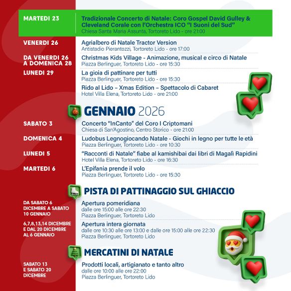 Per il Natale Tortoretano 2025 torna la pista di pattinaggio sul ghiaccio, unitamente a tanti eventi per bambini e per le loro famiglie – ha dichiarato l’Assessore al Turismo, alla Cultura ed alla Promozione del Territorio Giorgio Ripani – Confermato anche il tradizionale Concerto di Natale, che vedrà esibirsi il Coro Gospel di David Gulley, direttamente da Cleveland (Ohio), con l’eccezionale esecuzione sinfonica della ICO Suoni del Sud.