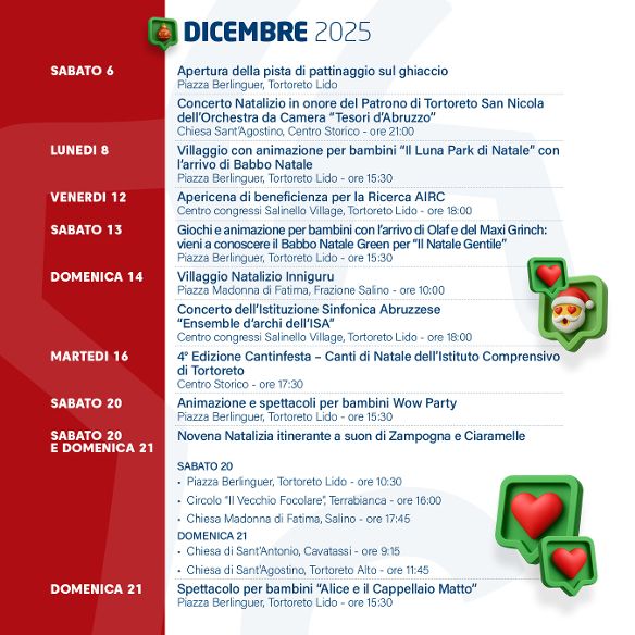 Con i numerosi eventi ludici e culturali organizzati per queste festività vogliamo creare momenti in cui la comunità di Tortoreto possa riunirsi e condividere gioia, musica e divertimento – ha concluso il Sindaco Domenico Piccioni – L’amministrazione comunale augura ai concittadini ed ai visitatori un buon Natale ed un felice anno nuovo.