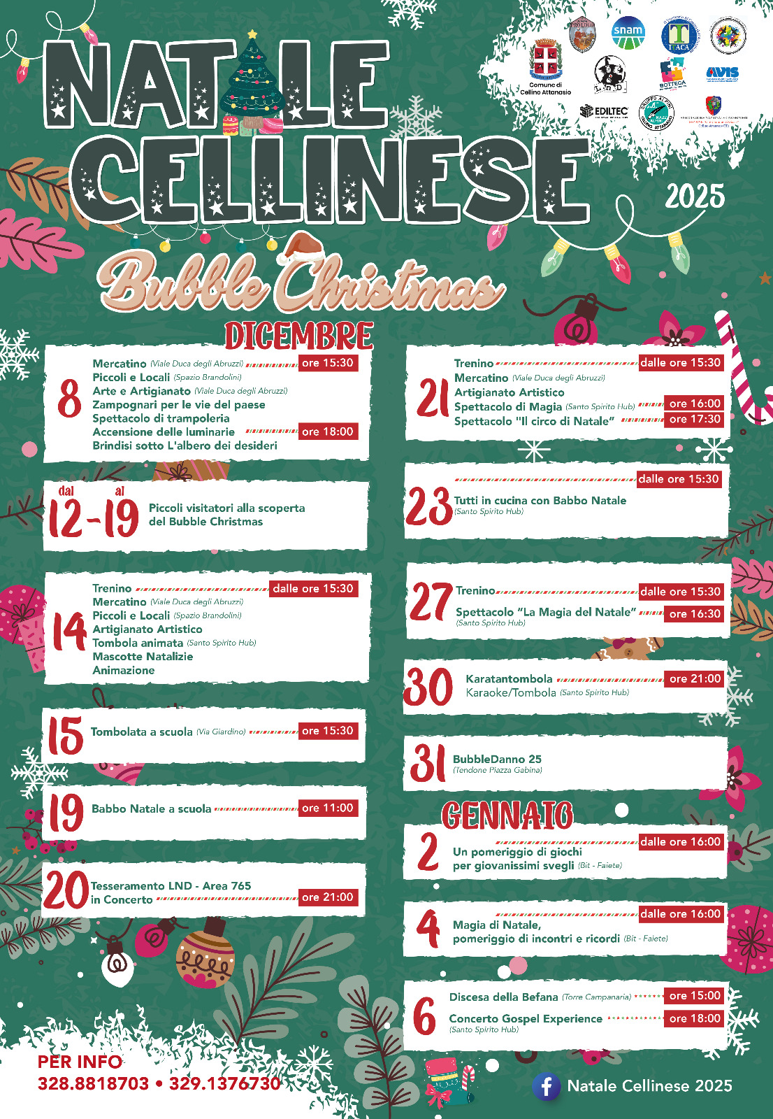 Il Comune di Cellino Attanasio presenta il programma di Natale Cellinese 2025 – Bubble Christmas, un ricco calendario di appuntamenti che, dall’8 dicembre al 6 gennaio, animerà il paese con atmosfere luminose, iniziative per famiglie, spettacoli e momenti di condivisione.