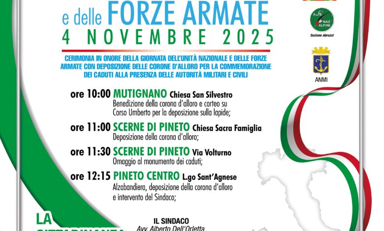 Le celebrazioni si terranno martedì 4 novembre 2025 e vedranno la partecipazione delle Autorità civili e militari, delle associazioni combattentistiche e d’arma, delle scuole e della cittadinanza. L’iniziativa è organizzata dal Comune di Pineto in collaborazione con la locale ANPI, l’ANA Sezione Abruzzi e l’ANMI.