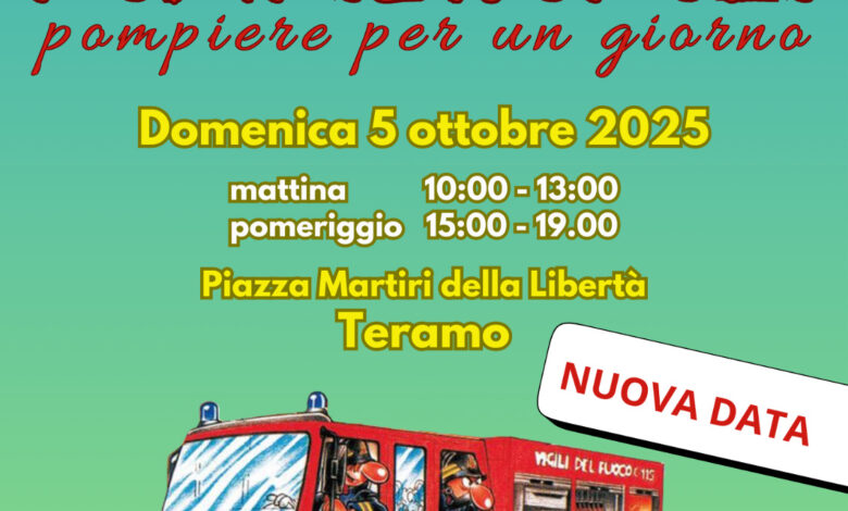 Teramo. Dopo il rinvio di domenica scorsa a causa delle previsioni meteorologiche avverse, nella giornata di domani, domenica 5 ottobre, dalle ore 10 alle 13 e dalle 15 alle 19, torna in Piazza Martiri della Libertà a Teramo la manifestazione “Pompieropoli – Pompiere per un giorno”.