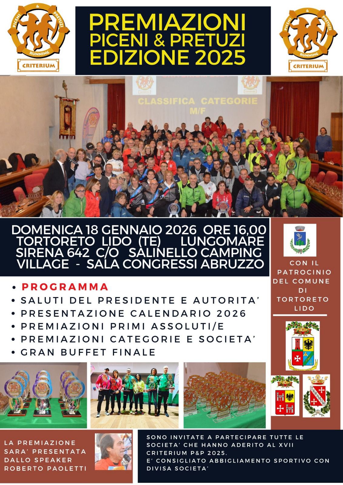 L’appuntamento del 18 gennaio a Tortoreto Lido, nella Sala Congressi Abruzzo del Salinello Camping Village (lungomare Sirena), ospiterà la tradizionale premiazione annuale con riferimento alla stagione 2025: per gli atleti e le società podistiche delle province di Teramo, Ascoli Piceno e Fermo — la “culla” del Criterium Piceni&Pretuzi — sarà una grande festa e una passerella collettiva per celebrare insieme i risultati della scorsa stagione e premiare i protagonisti della classifica assoluta, quelli distintisi nelle categorie individuali e le società che si sono particolarmente distinte.