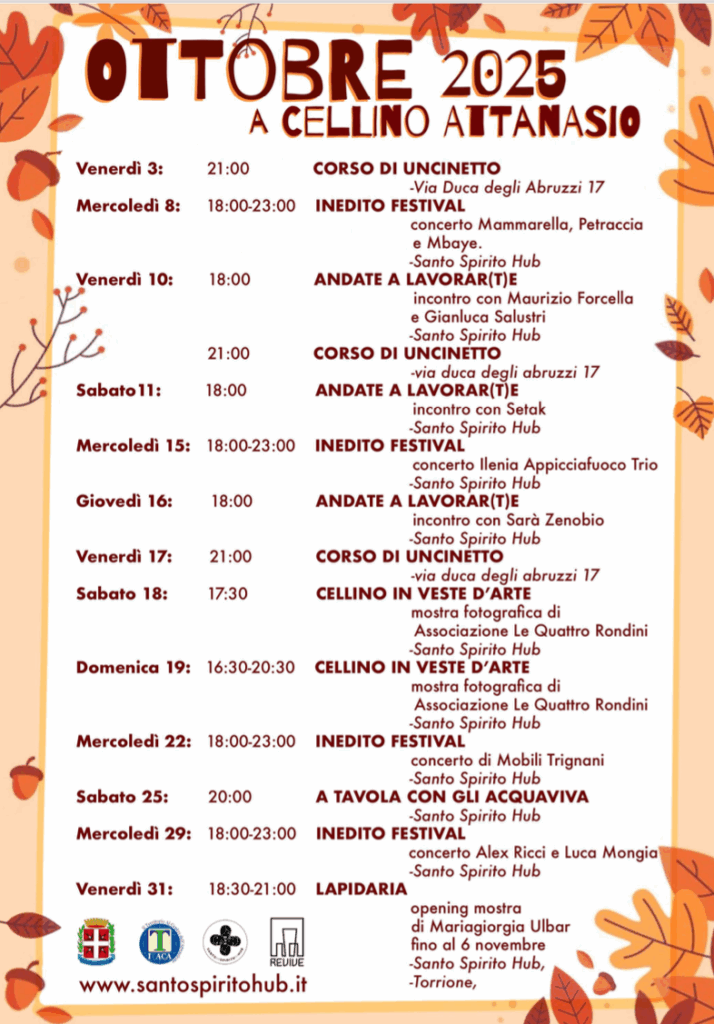 Il Festival terminerà il 29 ottobre con il duo Alex Ricci & Luca Mongia, sempre alle 21 a ingresso libero. Apprezzata anche la mostra fotografica ‘Cellino in veste d’arte’, curata dall’associazione Le Quattro Rondini aperta lo scorso fine settimana con la presentazione affidata a Francesca Petrosino, Ivana Ripà e Rita Cipolletti. Domani, sabato 25 ottobre, il borgo si immergerà in un’atmosfera medievale con ‘A tavola con gli Acquaviva’, corteo storico, spettacoli e cena a cura della Pro Loco di Cellino Attanasio APS. Il mese si chiuderà con LAPIDARIA, mostra-azione della poeta Mariagiorgia Ulbar dal 31 ottobre al 6 novembre 2025 con inaugurazione il 31 ottobre alle 18,30. Il 2 novembre è inoltre in programma un laboratorio di scrittura alle ore 16.