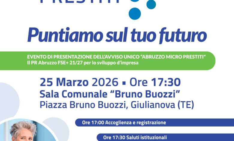 Giulianova. Domani, 25 marzo alle ore 17:30 nella Sala Comunale “Bruno Buozzi”, si terrà la presentazione ufficiale del programma “Abruzzo Micro Prestiti”, una nuova e significativa misura per donne e giovani imprenditori finanziata nell’ambito del FSE Plus Abruzzo 2021/2027.