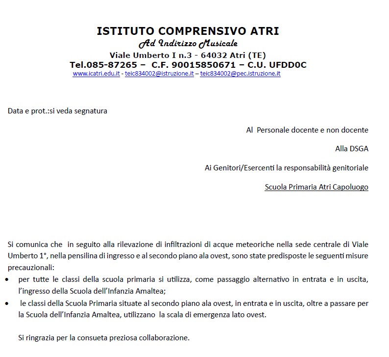 “Ieri, senza alcuna comunicazione preventiva, i bambini sono stati fatti entrare e uscire da un ingresso secondario per motivi di sicurezza, e la Dirigente scolastica si è vista costretta a ratificare questo provvedimento durante la mattinata tramite una circolare che dice testualmente: «in seguito alla rilevazione di infiltrazioni di acque meteoriche nella sede centrale di Viale Umberto I, nella pensilina di ingresso e al secondo piano dell’ala ovest, sono state predisposte le seguenti misure precauzionali […]».