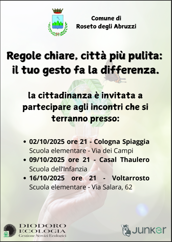 Il Comune di Roseto degli Abruzzi, con il sostegno della Diodoro Ecologia, lancia una serie di incontri di sensibilizzazione a livello di quartiere per promuovere la pulizia della città e il corretto conferimento dei rifiuti attraverso la campagna “Regole chiare, città più pulita: il tuo gesto fa la differenza”.