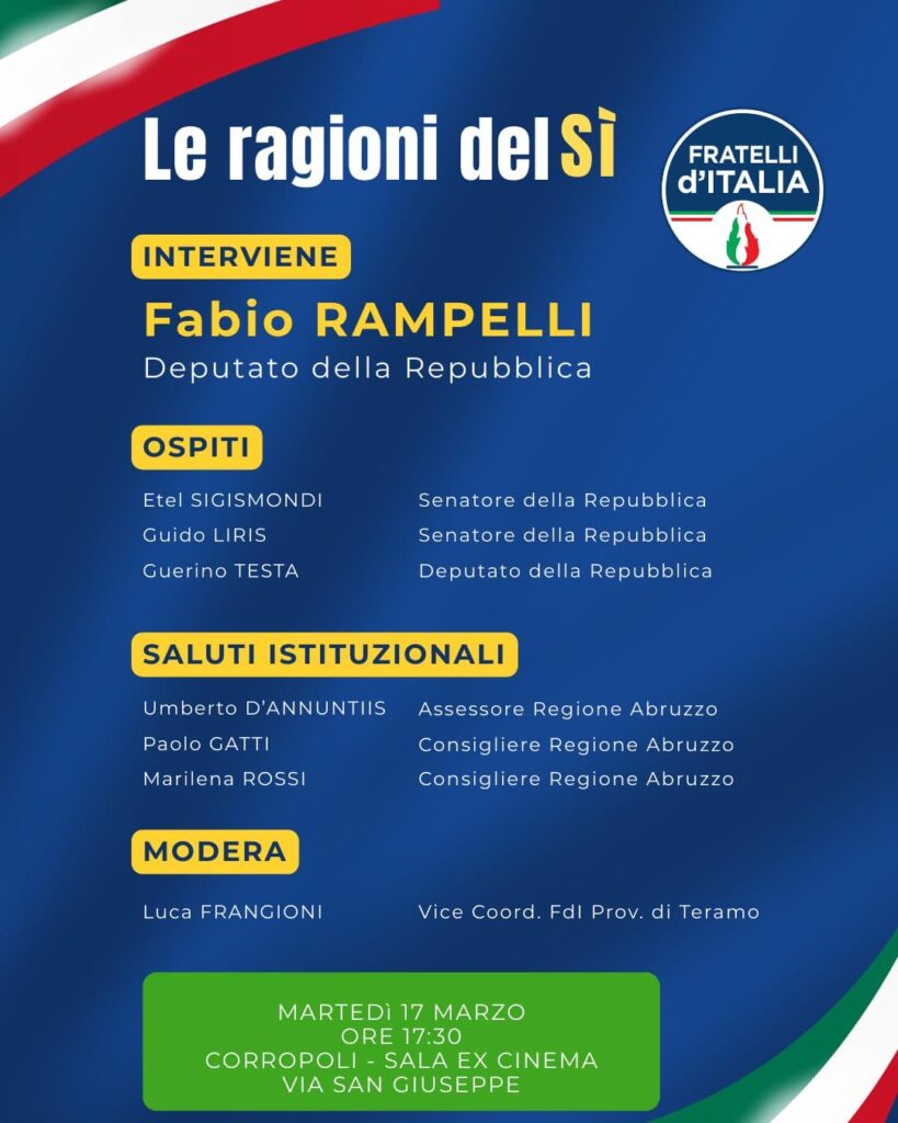 Parteciperanno, infatti, anche il Senatore Etel Sigismondi, il Senatore Guido Liris e il Deputato Guerino Testa, che approfondiranno i contenuti del referendum e le motivazioni che spingono a sostenere il Sì.