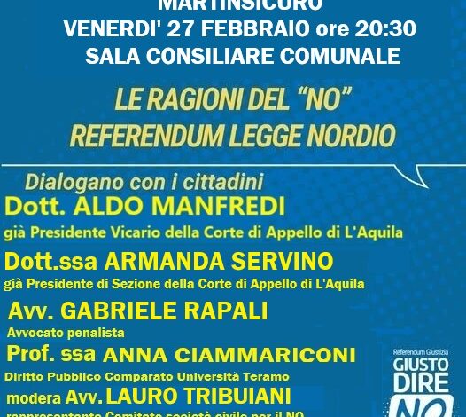 Martinsicuro. Un importante momento di confronto pubblico sul referendum relativo alla Legge Nordio si terrà venerdì 27 febbraio alle ore 20:45, in Sala Consiliare Comunale di Martinsicuro.
