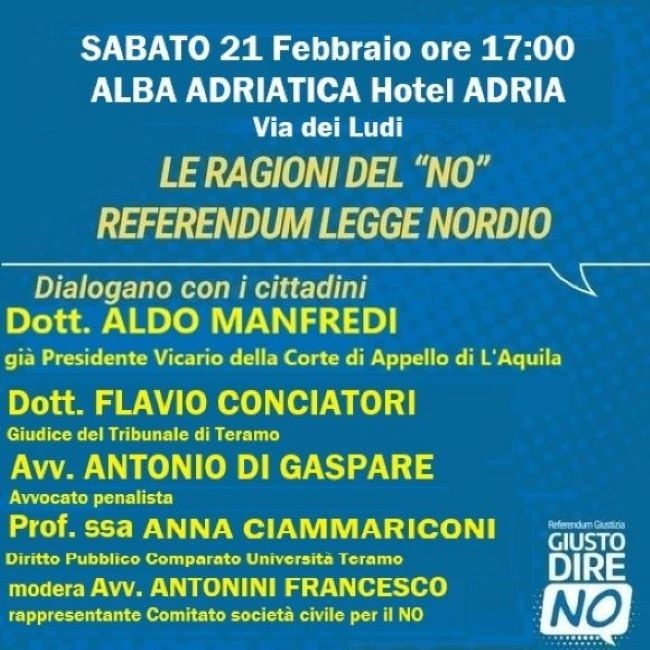 Alba Adriatica. Sabato 21 febbraio (ore 17 all’Hotel Adria di Alba Adriatica) si terrà un incontro pubblico sul referendum sulla legge Nordio. Incontro pubblico sulle ragioni del No.
