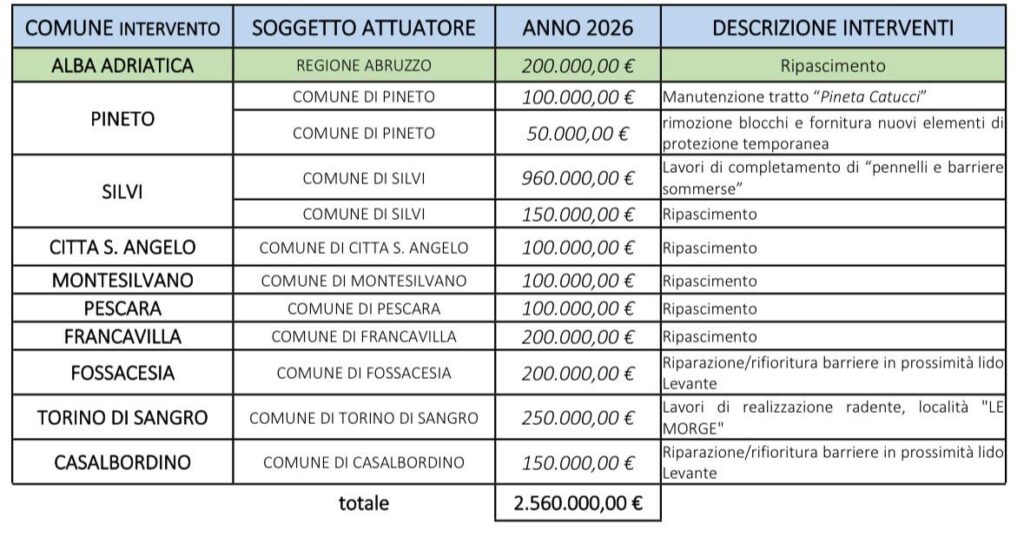 “Grazie ai fondi FSC – ha dichiarato l’assessore D’Annuntiis – abbiamo iniziato a realizzare un programma senza precedenti per combattere l’erosione costiera, un fenomeno che minaccia le infrastrutture e il futuro del turismo, settore vitale dell’economia regionale. Con le risorse assegnate con questa delibera di giunta, si danno risposte immediate alle esigenze dei comuni al fine di consentire, nelle zone più esposte, l’avvio della prossima stagione balneare.