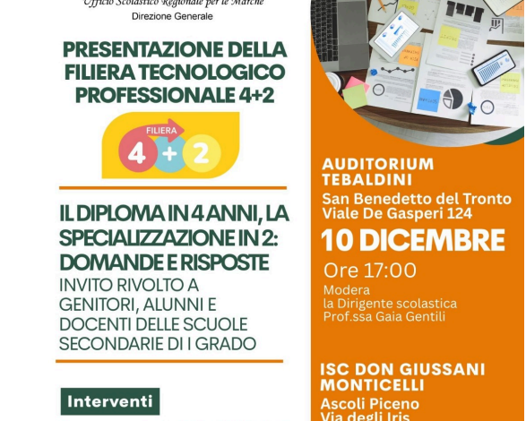 Il nuovo percorso formativo verrà presentato a studenti, famiglie e docenti, nell’ambito di due appuntamenti organizzati dall’Ufficio Scolastico Regionale per le Marche, in collaborazione con gli Istituti Comprensivi e gli Istituti Tecnici e Professionali del territorio, il 10 dicembre, alle ore 17:00, all’Auditorium Tebaldini di San Benedetto del Tronto (Viale De Gasperi n.124) e il 12 dicembre, alle ore 17:00, all’ISC Don Giussani Monticelli di Ascoli Piceno (via degli Iris).