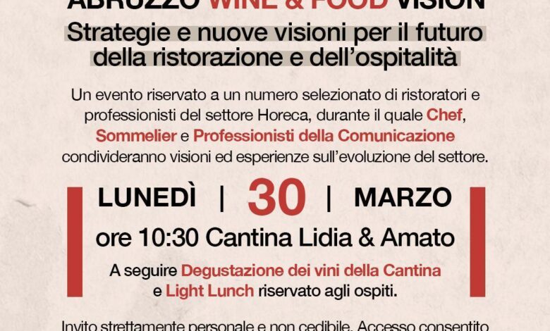 Abruzzo Wine & Food Vision è il tema dell’iniziativa in programma lunedì 30 marzo (ore 10.30) nella cantina Lidia&Amato a Controguerra.