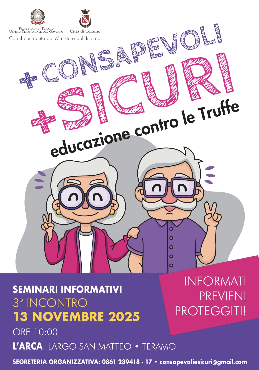 Giovedì 13 novembre, a L’ARCA, alle ore 10:00,si svolgerà l’ultimo incontro della campagna di educazione e prevenzione contro le truffe promossa e organizzata dal Comune di Teramo in collaborazione con la Prefettura, la CNA e le diverse forze dell’ordine.