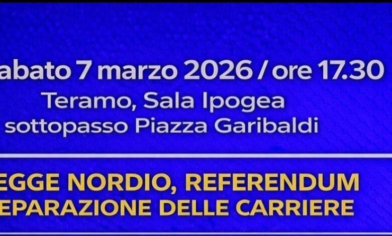 Sabato 7 marzo, alle ore 17:30, nella Sala Ipogea del sottopasso di Piazza Garibaldi a Teramo, si terrà un incontro pubblico dal titolo “Legge Nordio, Referendum e Separazione delle Carriere”. L’evento – promosso da esponenti del mondo giuridico, istituzionale e della società civile – vuole offrire ai cittadini una chiara informazione sulle ragioni del voto “NO” al referendum sulla giustizia, a tutela della Costituzione della Repubblica Italiana, dell’indipendenza della magistratura e dell’unità delle istituzioni giudiziarie.