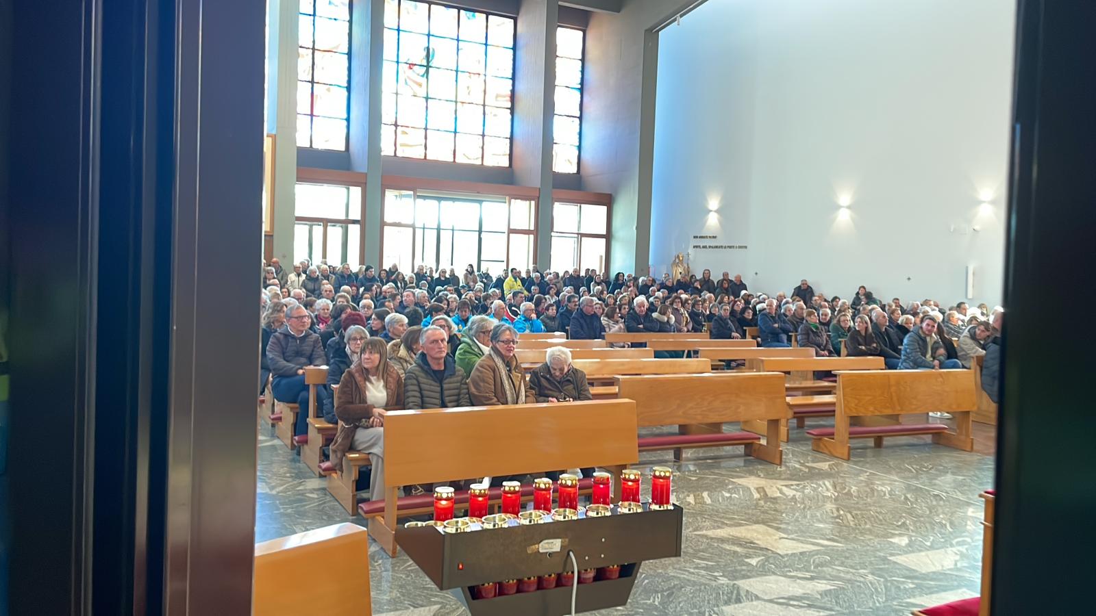 E la chiesa che don Aldino aveva pensato era piena come non mai, con tanta gente rimasta fuori per seguire il rito funebre.